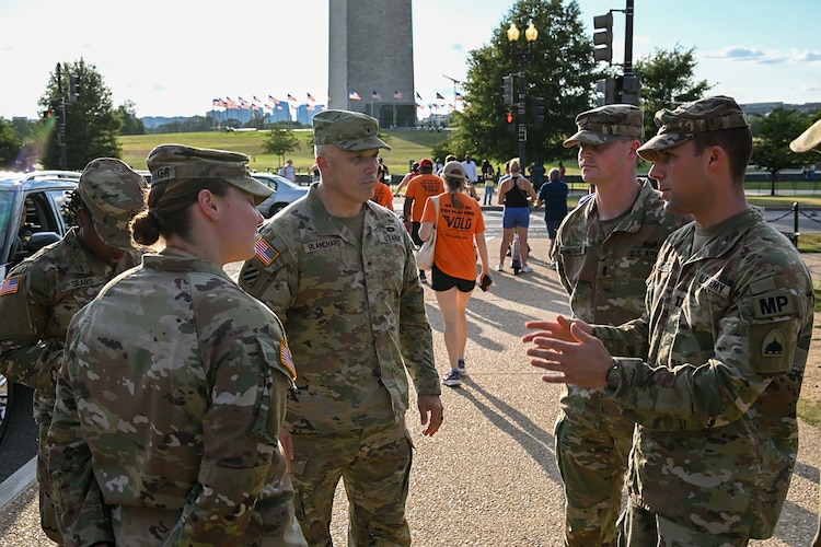 U.S. Army Brig. Gen. Leland D. Blanchard II, the Adjutant General of the District of Columbia Army National Guard, visits with soldiers assigned to the 273rd Military Police Company, during patrol operations at the National Mall, August 12, 2025. IMAGE/Staff Sgt. Deonte Rowell/U.S. Army /ABC News