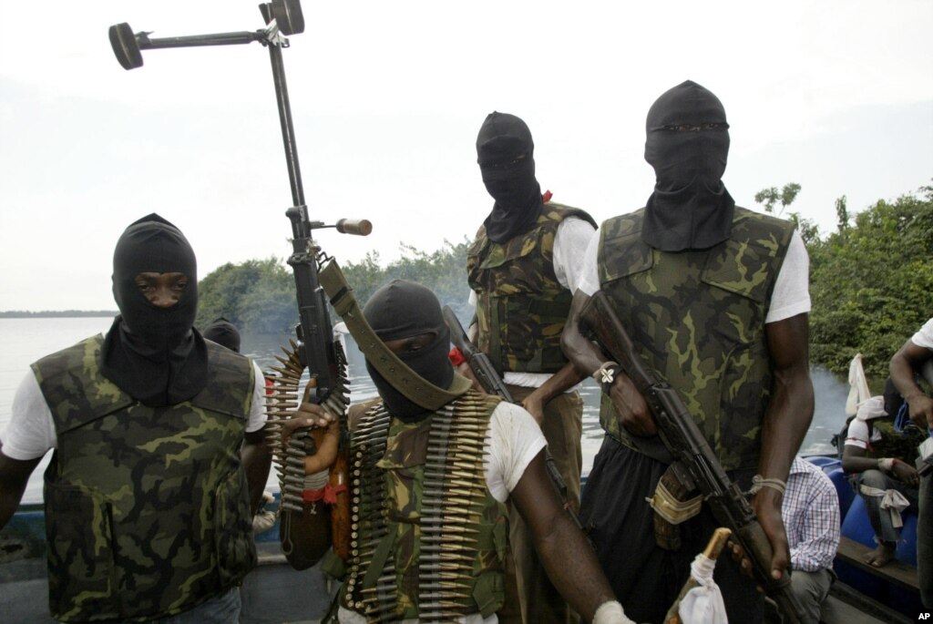 Members of Movement for the Emancipation for the Niger Delta, (MEND) a militant group patrol the creeks in the Niger Delta area of Nigeria on Feb. 24, 2006. PHOTO/VOA