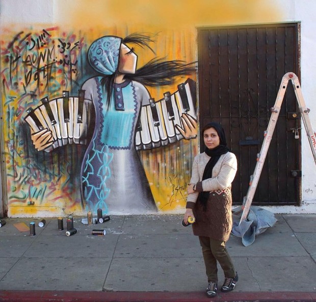 Shamsia Hassani with a mural she painted on West Adams Boulevard in Los Angeles, California IMAGE/Facebook/Shamsia Hassani