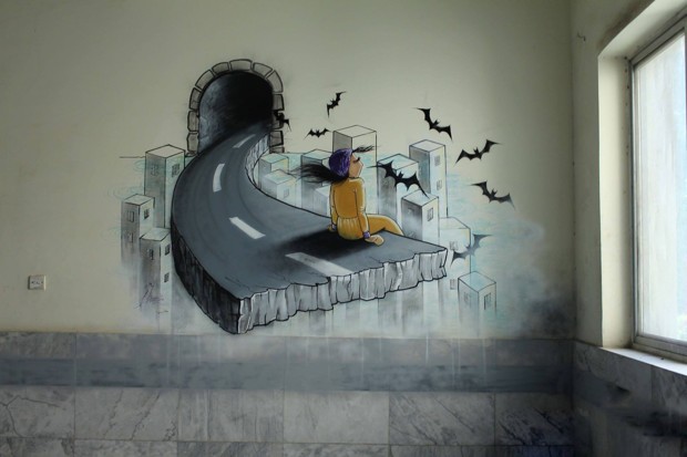 From Shamsia Hassani’s “Birds of No Nation” series, at Kabul University IMAGE/Facebook/Shamsia Hassani