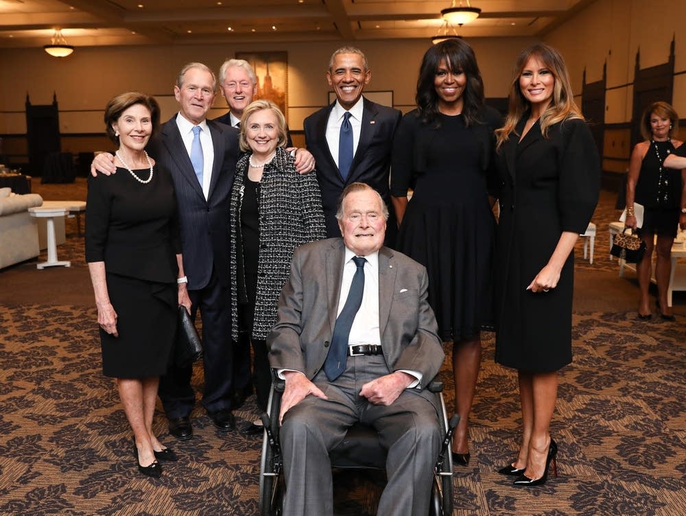 Former first lady Laura Bush, former President George W. Bush, former President Bill Clinton, former Secretary of State and first lady Hillary Clinton, former President Barack Obama, former President George H. W. Bush, former first lady Michelle Obama and current first lady Melania Trump pose for a group photo at the funeral ceremony for the late first lady Barbara Bush at St. Martin’s Episcopal Church on April 21, 2018 in Houston, Texas. PHOTO/Paul Morse/George W. Bush Presidential Center via Getty Images/MPR News