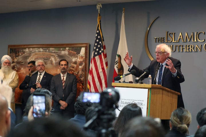 Sen. Bernie Sanders speaks after meeting with interfaith leaders at the Islamic Center of Southern California in Los Angeles on March 23. PHOTO/Lucy Nicholson/Reuters