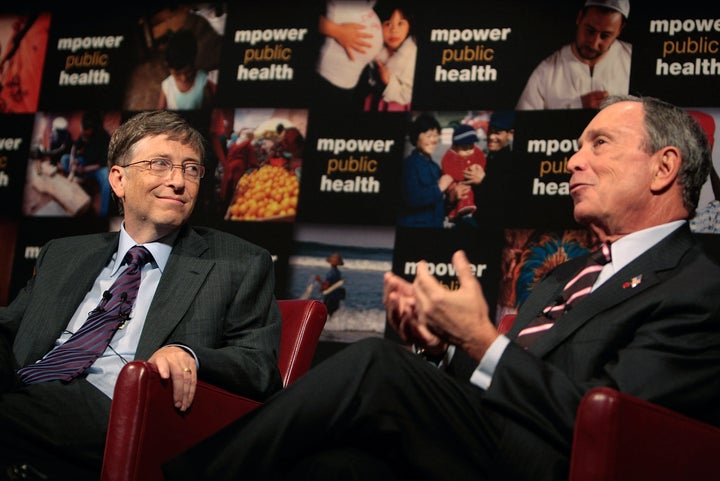 Bill Gates (left) and Michael Bloomberg hold a press conference to announce their charitable support for a global anti-smoking initiative on July 23, 2008, in New York City. PHOTO/Chris Hondros via Getty Images