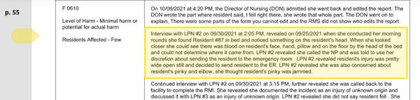 This excerpt from the July 3, 2021, state inspection report of Landmark of Louisville Rehabilitation and Nursing includes an interview with a nurse who found an injured resident. IMAGE/ New York State attorney general’s office