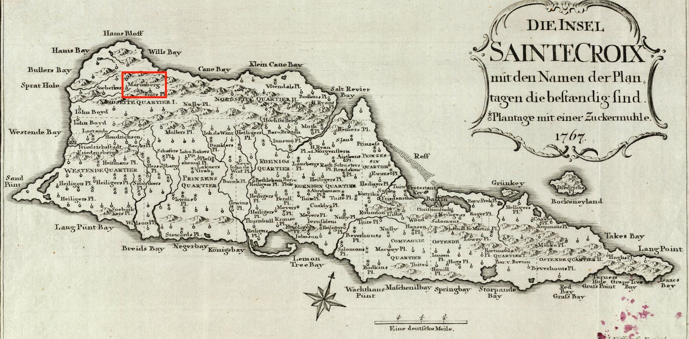 “For a long time now, a large number of [escaped slaves] have established themselves on lofty Maroon Hill in the mountains toward the west end of the island [of St. Croix]. … They are there protected by the impenetrable bush and by their own wariness.”