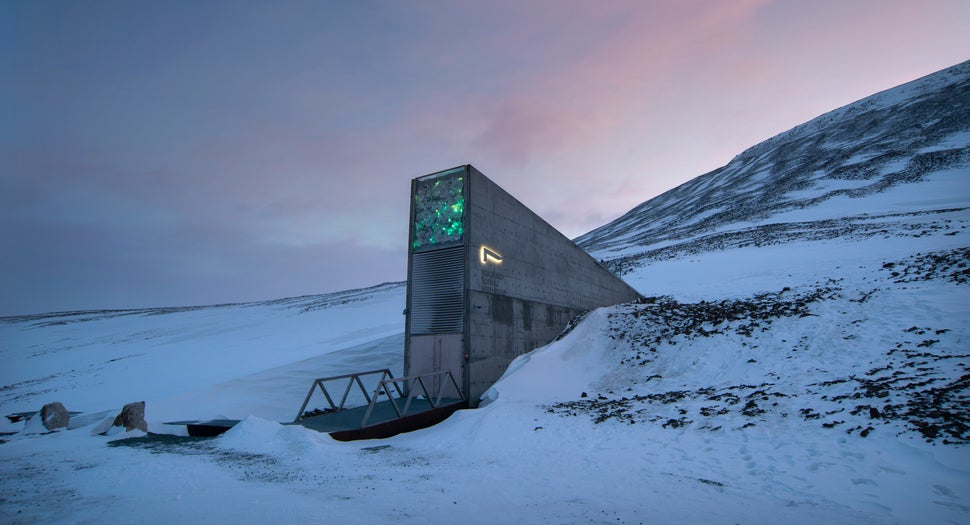 The “Doomsday Vault” lies within the Arctic Circle on the island of Spitsbergen, about halfway between mainland Norway and the North Pole. All that can be seen from outside the vault is the entrance ? a futuristic jut of concrete, illuminated with blue-green fiber optic lights. The rest of the building stretches into the mountainside, sunk deep into the rock and permafrost to keep temperatures low. It is designed to remain at -0.4 degrees Fahrenheit (-18 degrees Celsius), even without power. It’s supposed to outlast humanity.